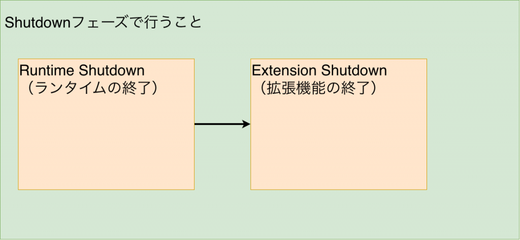 Shutdownフェーズは、関数がInvokeフェーズの完了後、実行環境が一定時間(数分程度)アイドル状態が続いた場合に、終了処理を行います