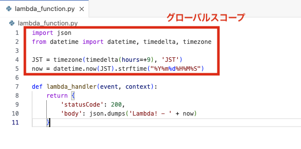 - 私たちの関数コードのグローバルスコープ(ハンドラ関数の外側)に記述されたコードが実行されます