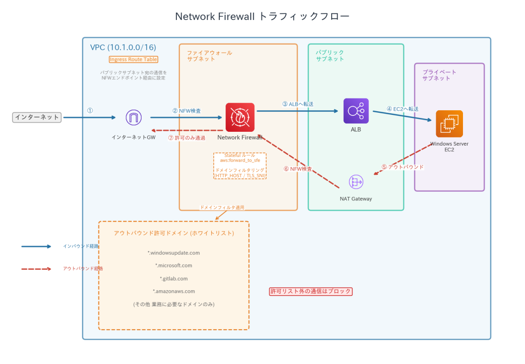 EC2 (Private Subnet) → NAT Gateway → Network Firewall → IGW → Internet(許可ドメインのみ)