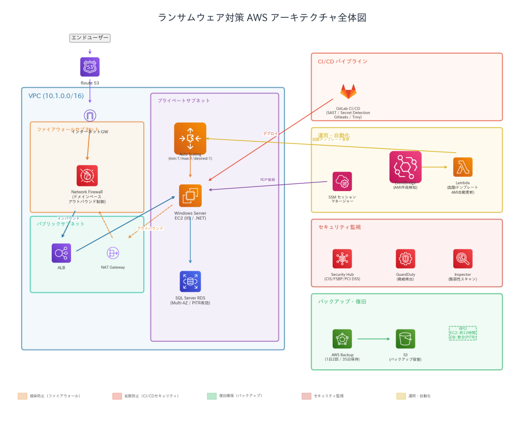 | 感染させない | Private Subnet配置、SSM Session Manager経由のRDP、Patch Manager、GitLab CI/CDによるセキュリティスキャン |