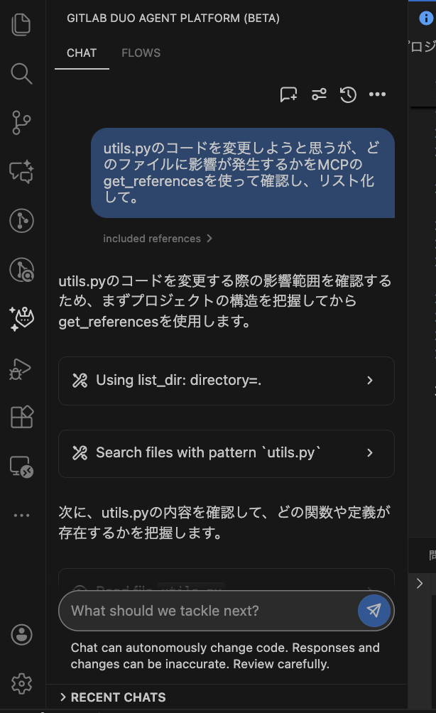 上記の準備が完了すると、Gitlab Duo Agent PlatformというチャットがVSCodeで利用できるようになります。